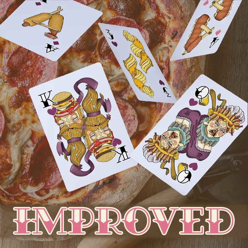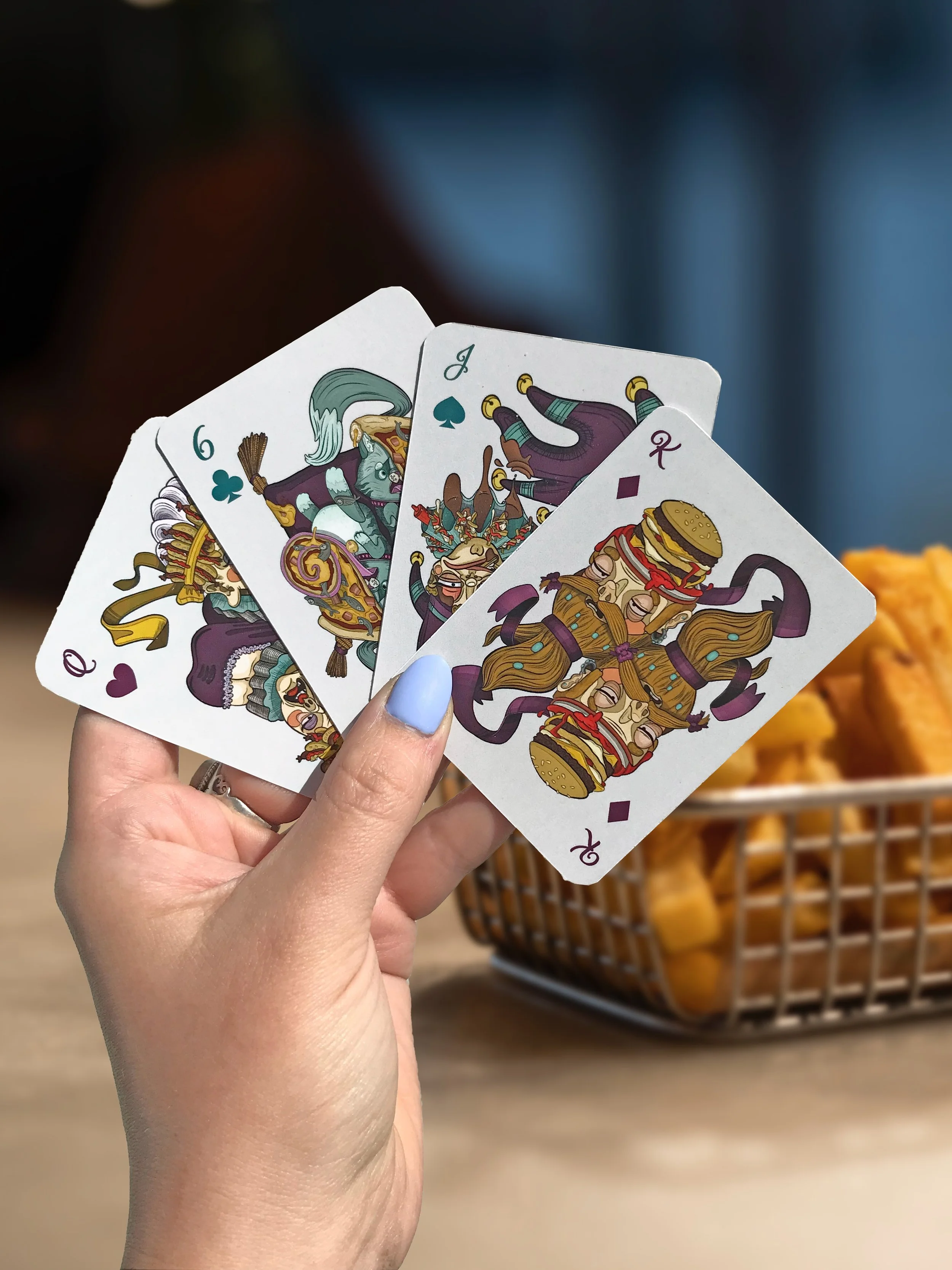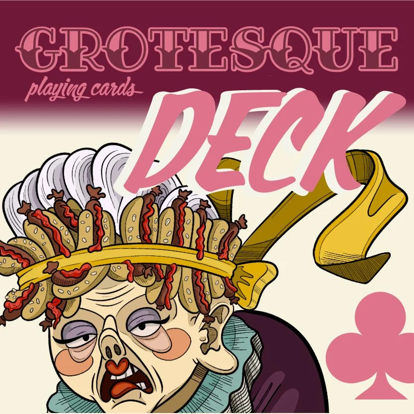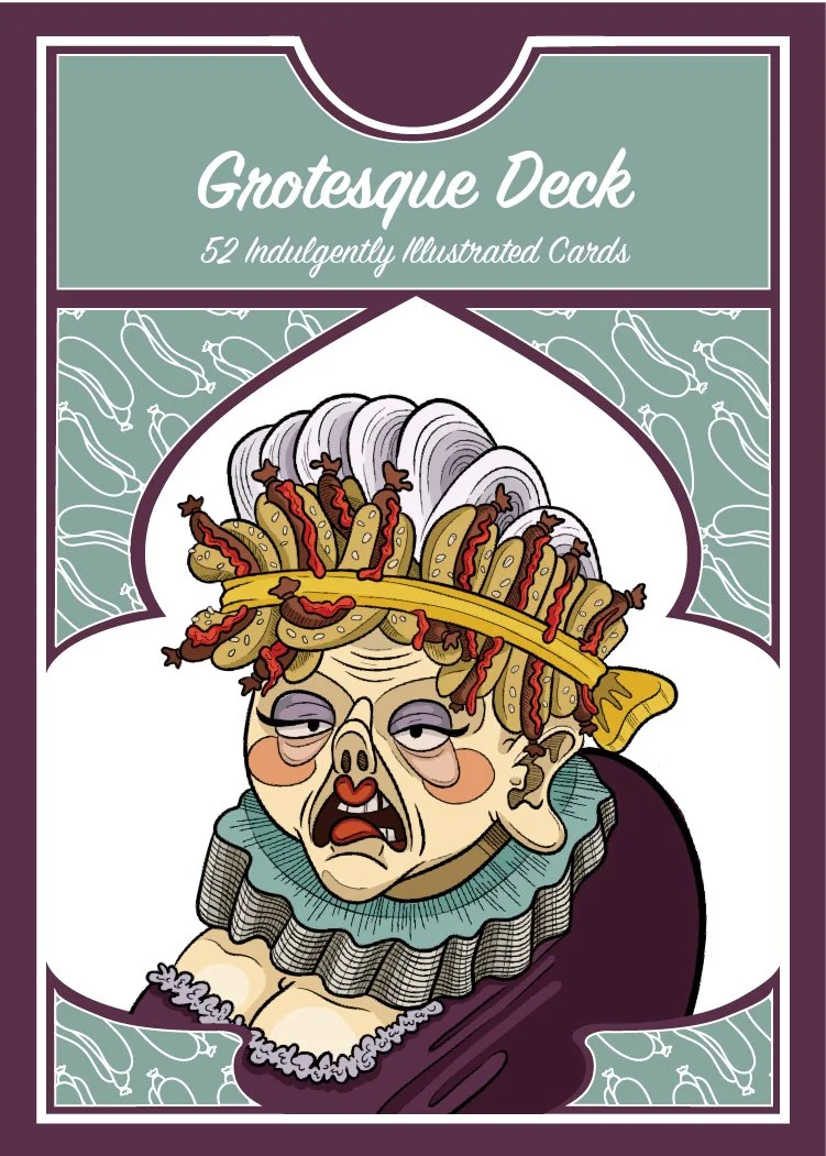 Playing cards inspired by overindulgence, the history of caricature and satire, and the guilty comforts of highly processed Canadian fast foods. The Grotesque Deck provides original illustrations for all four standard suits, including the Queen, King, Jack, Ace, Joker, and numbers two to ten.