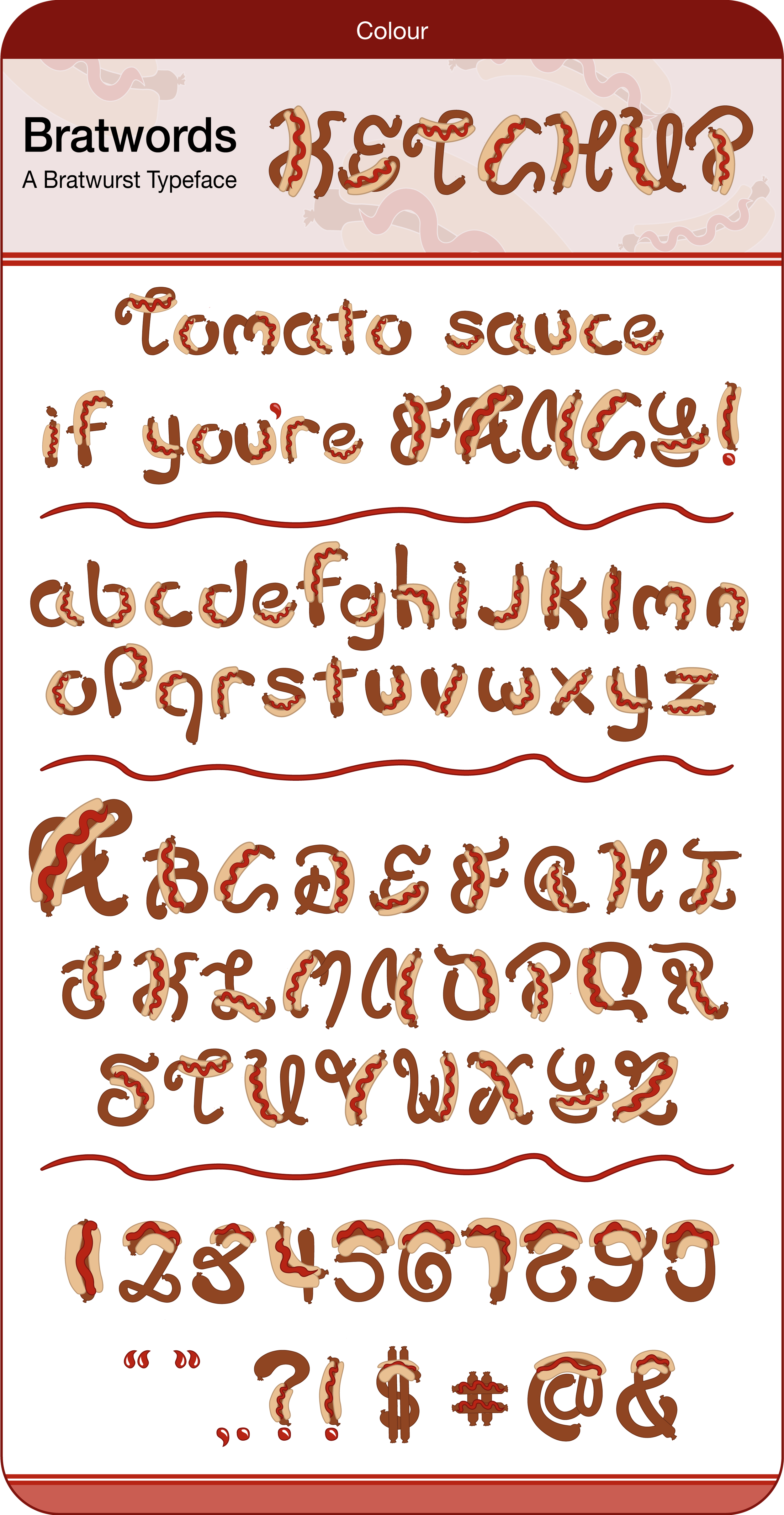 Red typography is bold, energetic, captivating and represents a sense of power and excitement. Its vibrant hue radiates a zest for life and creates a sense of urgency and importance. Whether used in a headline or as part of a design element, red typography demands to be seen and heard. And so does Bratwords Ketchup!