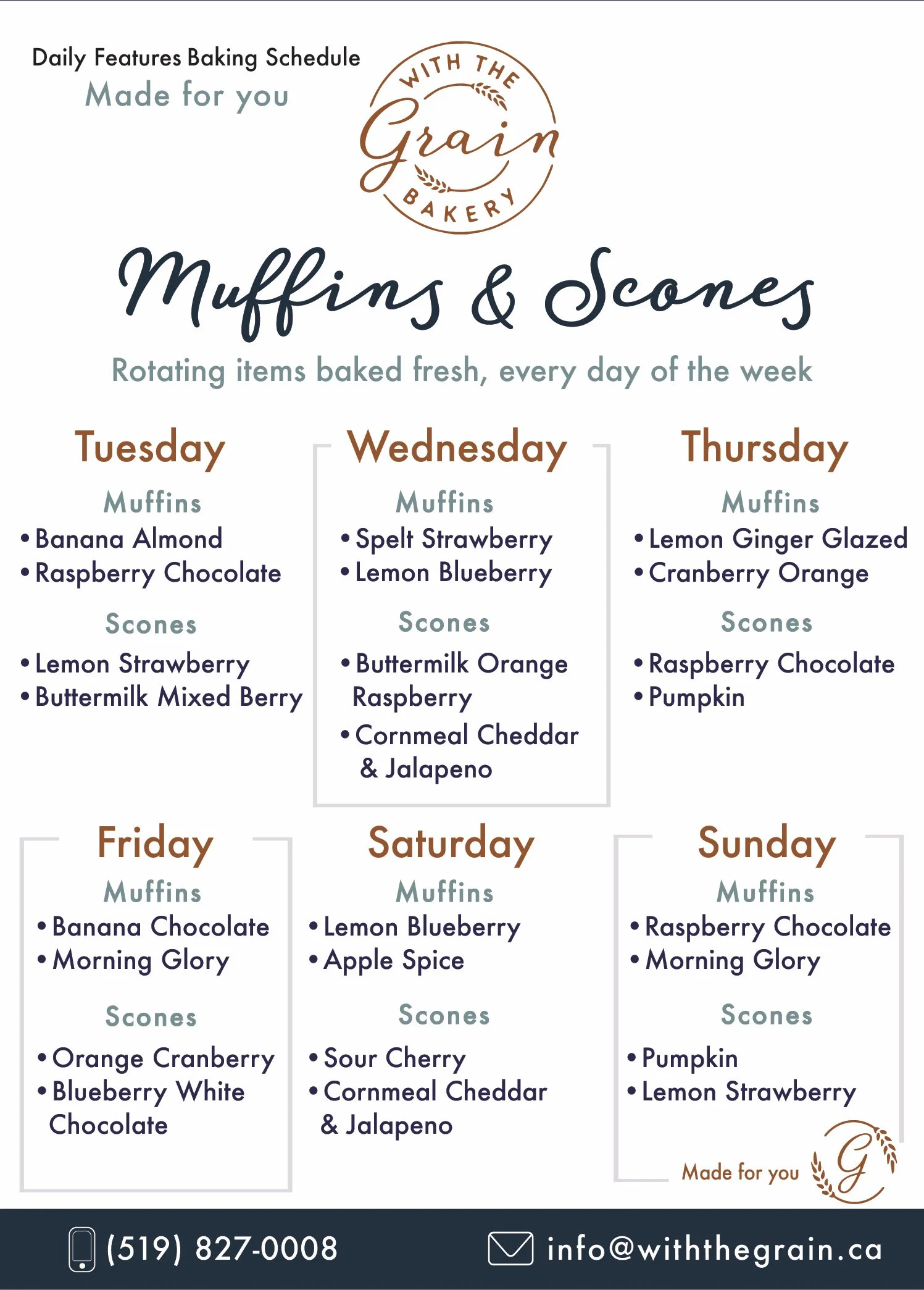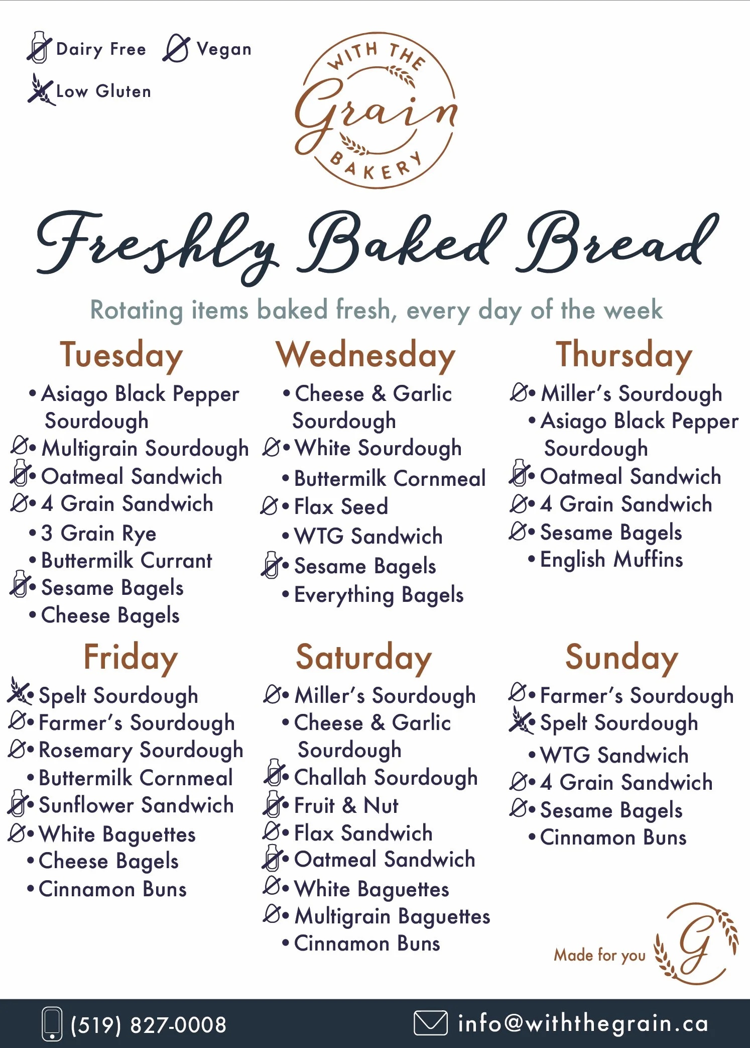 Every day of the week, a selection of fresh bread, muffins, and scones is available at the bakery. The earliest bakers arrive between three and four AM and begin preparing every menu item for the day. To know which items would be baked on any given day, customers could reference the large chalkboard sign hung on the wall. At the time, With the Grain’s social media platforms and website had not been updated frequently enough to provide current menu changes, which meant customers would have to remember the menu or take a photo with their mobile phones for reference. These free take-home menus were designed to be available at the front counter. They include the rotating schedule for every day of the week, as well as the dietary information often requested in-store.